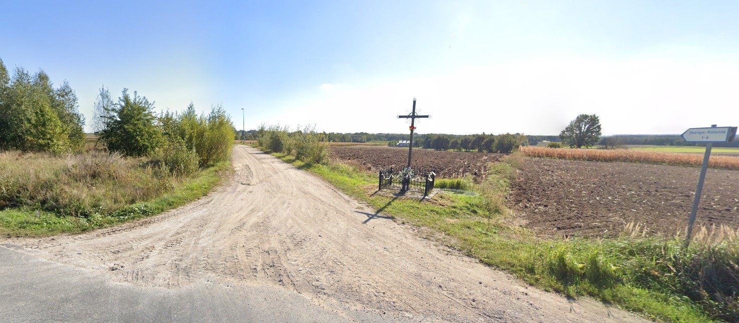 droga zwirowa wsrod pol. Obok drogi krzyz