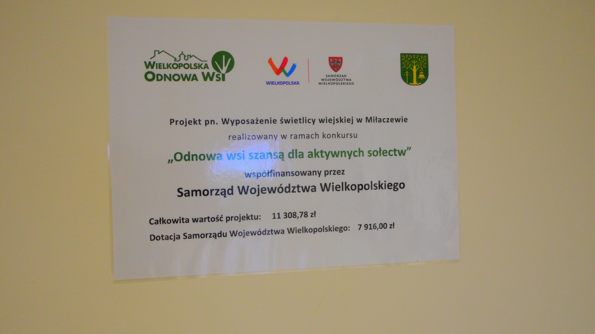 Całkowita wartość zadania wyniosła 11 308,78 zł, z czego 7 916,00 zł stanowiła dotacja z budżetu Województwa Wielkopolskiego, a 1 970,00 zł pochodziło z funduszu sołeckiego.